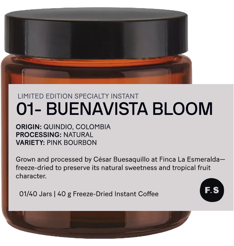 Buenavista Bloom is our latest micro-batch instant: a 40 g jar of freeze-dried single origin coffee made from a fresh roast of César Buesaquillo’s naturally processed Pink Bourbon lot.